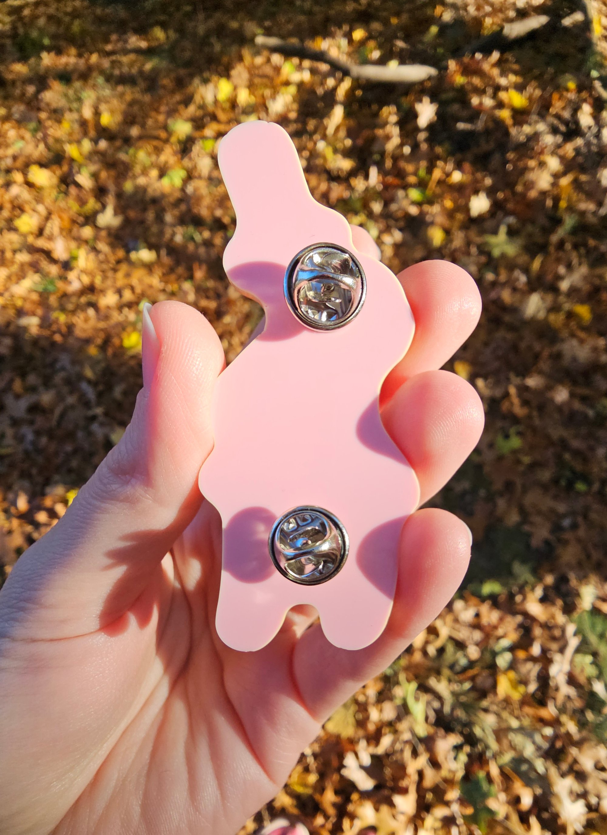 This pin is printed on pantone 509c (baby pink) acrylic, with a resin dome finish.